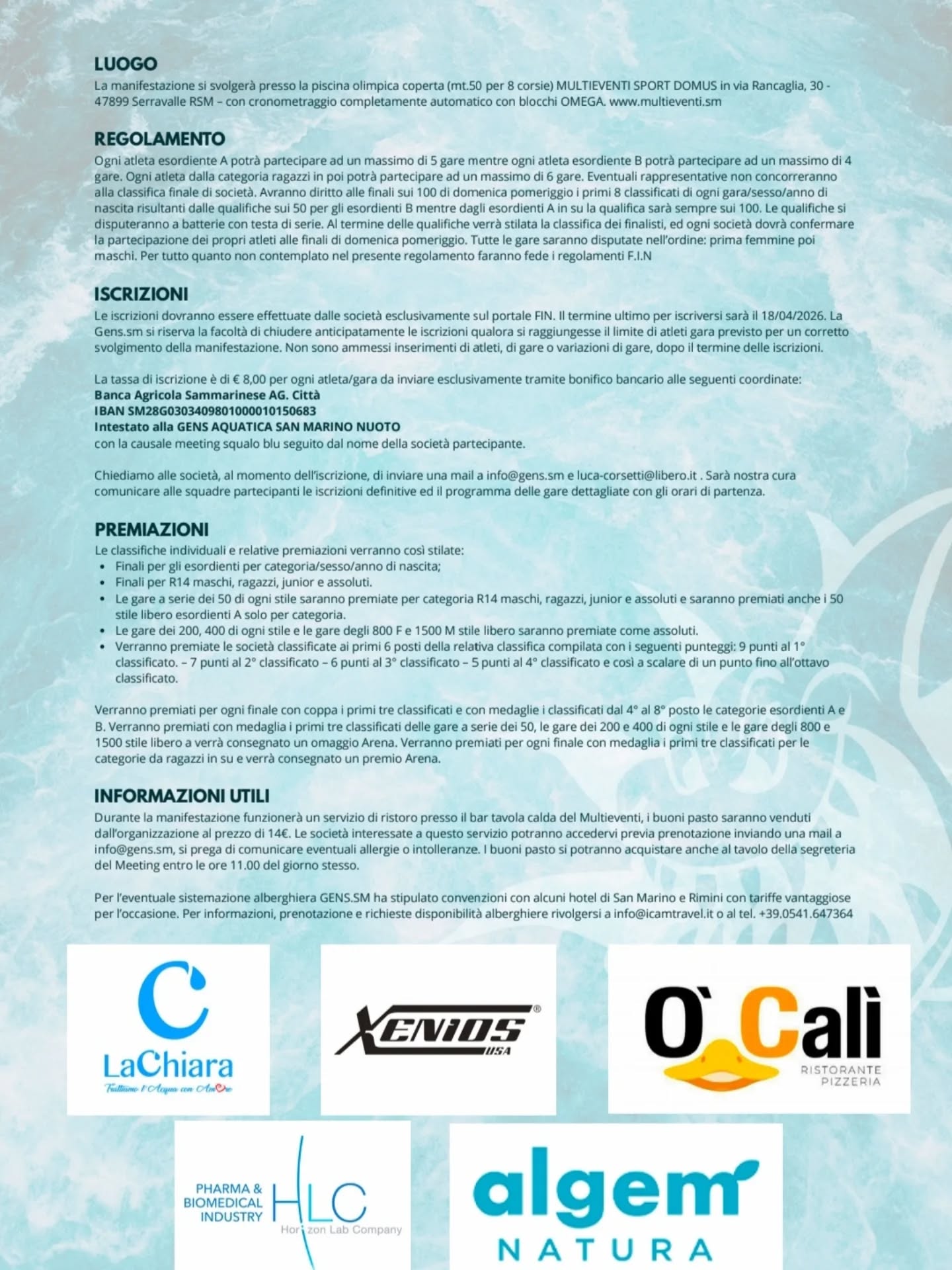 Gens Aquatica San Marino Nuoto comunica che in data odierna è stato raggiunto il numero di iscrizioni compatibili con la corretta gestione della gara.